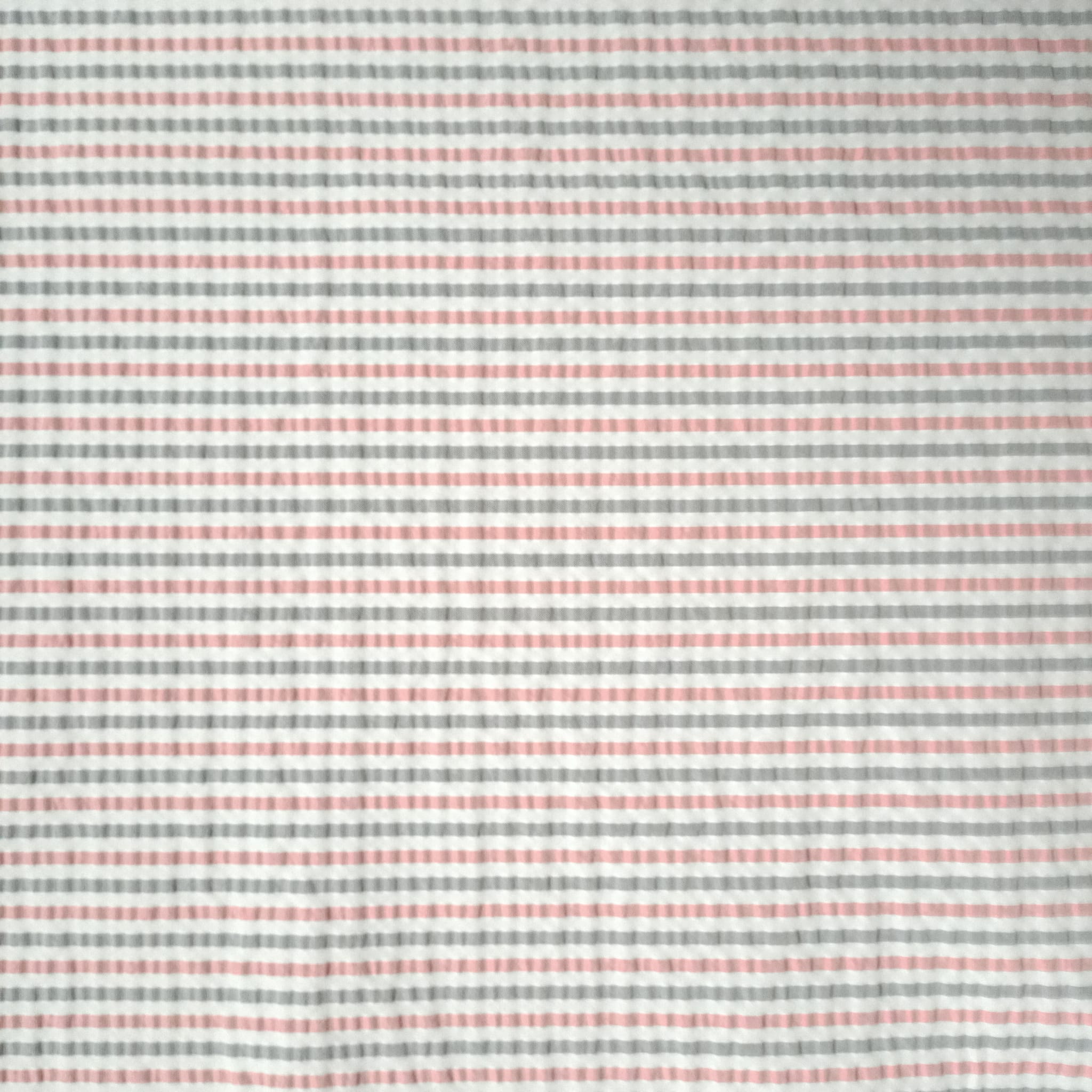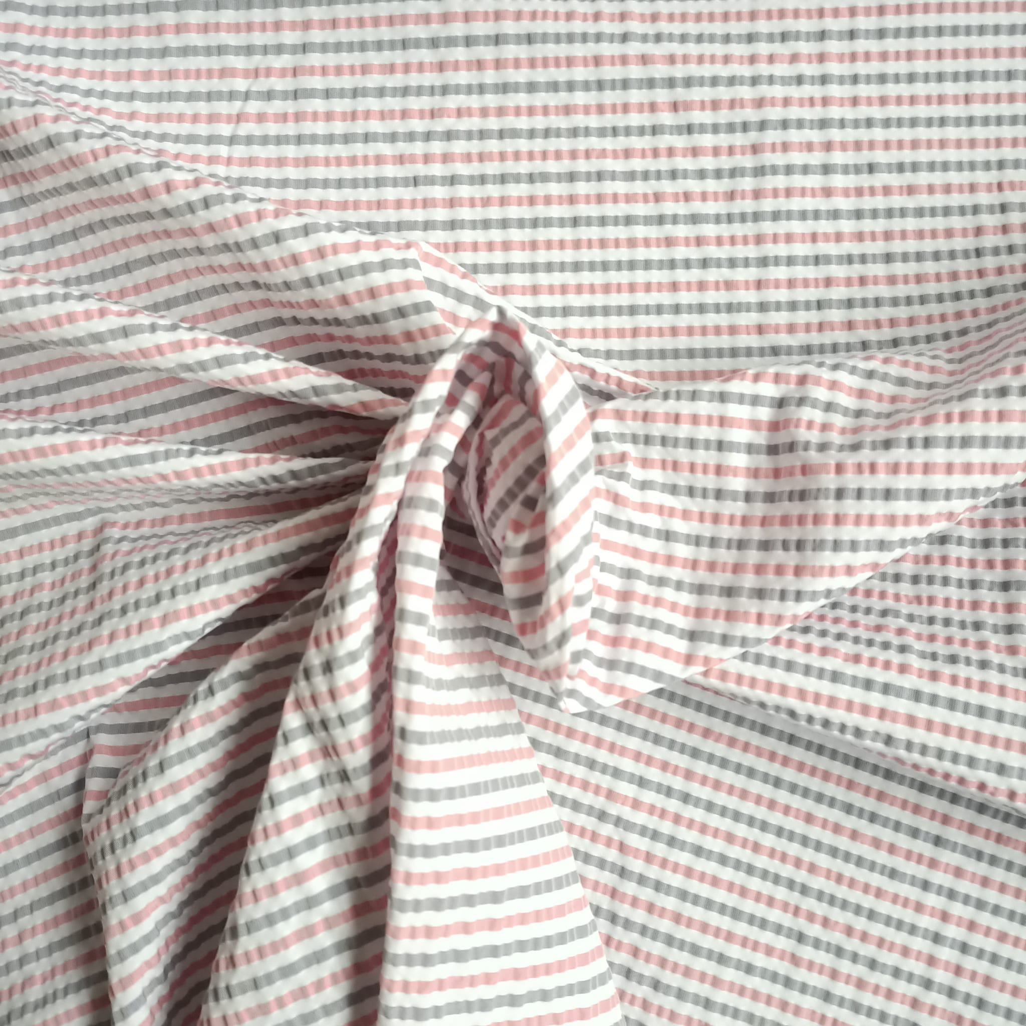 Tessuto rigato rosa e grigio effetto crespato su fondo bianco